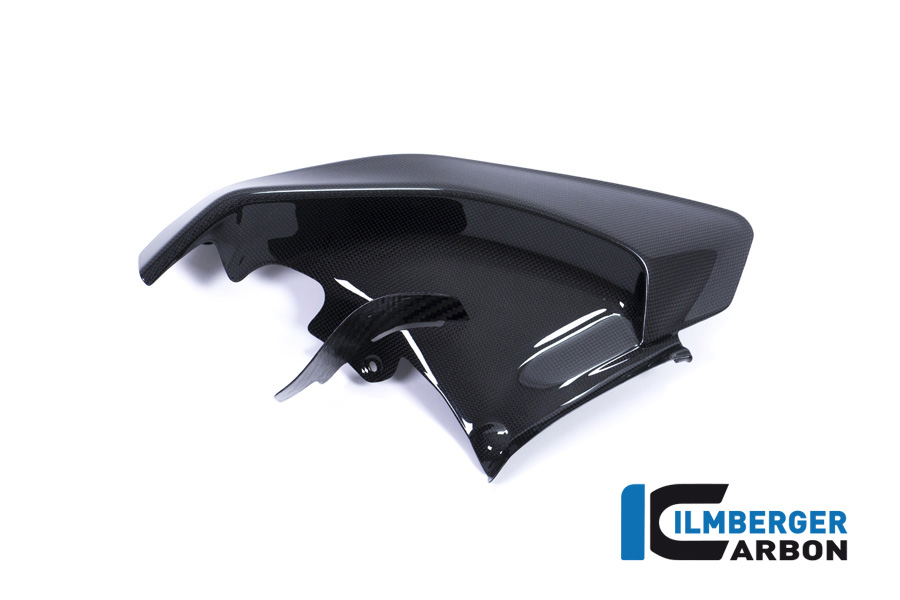 Die Abdeckung unter dem Rahmen (links) ersetzt das dortige Originalteil. Die Ilmberger Carbon Abdeckung wird an den serienmäßigen Punkten verschraubt. Das Carbonteil wird mit glänzender Oberfläche ausgeliefert und steht damit im Kontrast zu den, von Ducati Performance angebotenen, matten Carbonteilen.