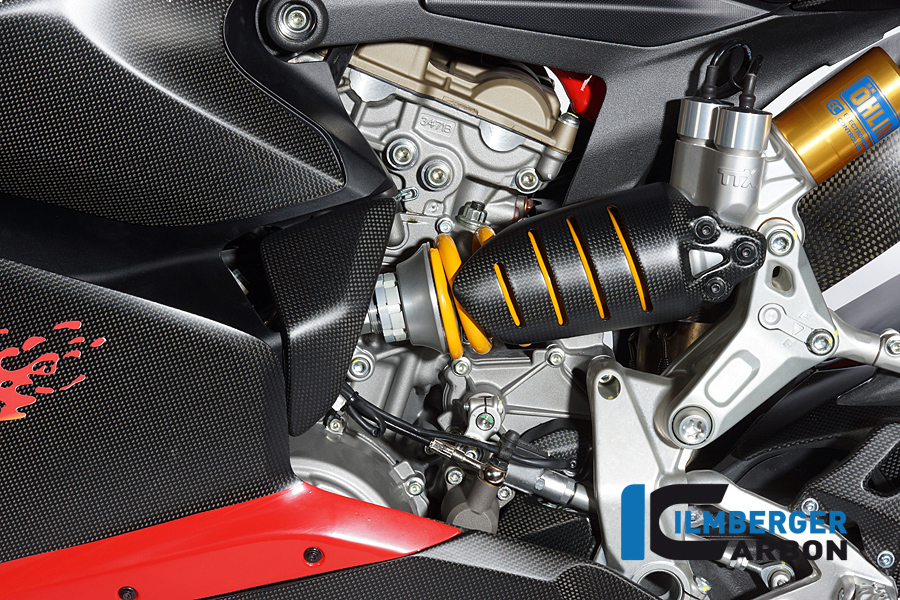Die Federbeinabdeckung in Carbon für die Ducati 1199 Panigale ersetzt das originale Bauteil unter Verwendung der originalen Befestigungspunkte. Im Vordergrund stehen Gewichtsersparnis (in der Regel Einsparung von ca. 70% im Vergleich zum originalen Bauteil) und höhere Steifigkeit.  Das Carbonteil wurde nach den neuesten Richtlinien im Autoklaven komplett aus Prepreg (siehe FAQ) Material gefertigt und im nächsten Schritt, wie bei uns üblich, zum Schutz gegen Umwelteinflüße mit einer klaren Kunststoffbeschichtung überzogen.
