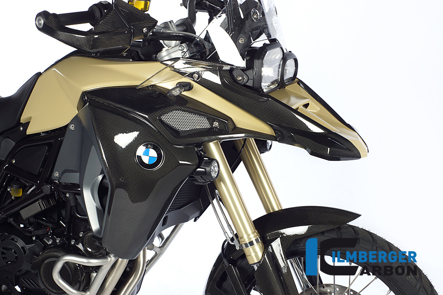 Die rechte Wasserkühlerabdeckung (zugleich Plakettenträger und Airboxeinlassverkleidung) in Carbon für die BMW F 800 GS Adventure  ersetzt das originale Bauteil unter Verwendung der originalen Befestigungspunkte. Im Vordergrund stehen Gewichtsersparnis (in der Regel Einsparung von ca. 70% im Vergleich zum originalen Bauteil) und höhere Steifigkeit.  Das Carbonteil wurde nach den neuesten Richtlinien im Autoklaven komplett aus Prepreg (siehe FAQ) Material gefertigt und im nächsten Schritt, wie bei uns üblich, zum Schutz gegen Umwelteinflüße mit einer klaren Kunststoffbeschichtung überzogen.
